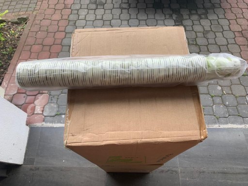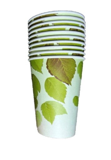 Białe kubki wykonane z PLA (skrobia kukurydziana), nadrukowane wzorem ekologicznym zielone liście (dwa wzory nadruku).