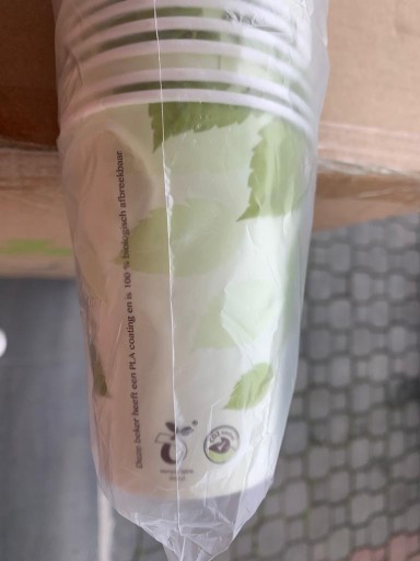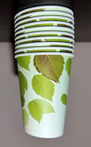 Białe kubki wykonane z PLA (skrobia kukurydziana), nadrukowane wzorem ekologicznym zielone liście (dwa wzory nadruku).