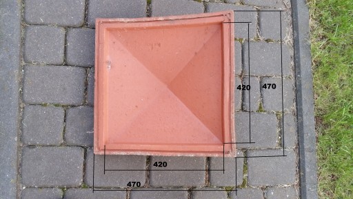 Daszek ceramiczny czterospadowy o podstawie kwadratu 490x490 mm . Kolor daszku ceglasty . Daszek jest wypalany . Waga jednej sztuki 14 kg