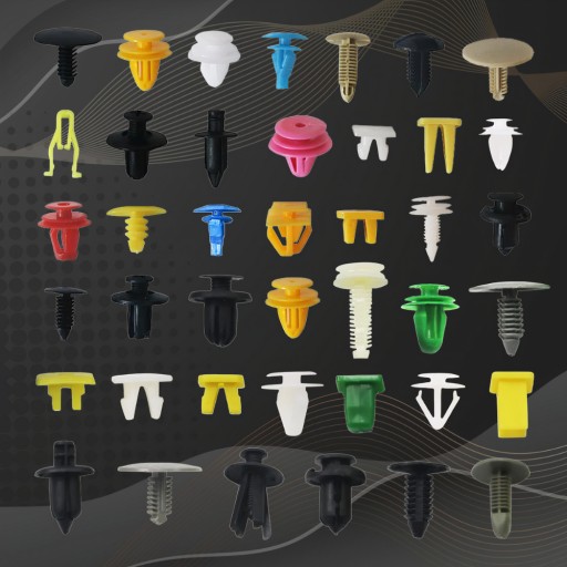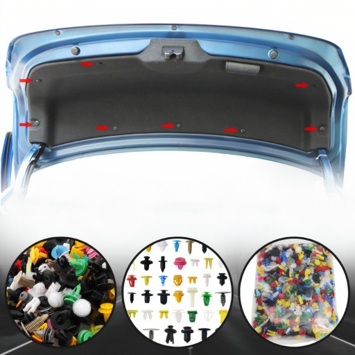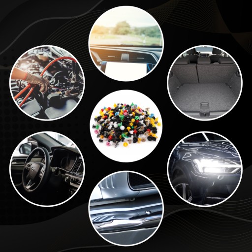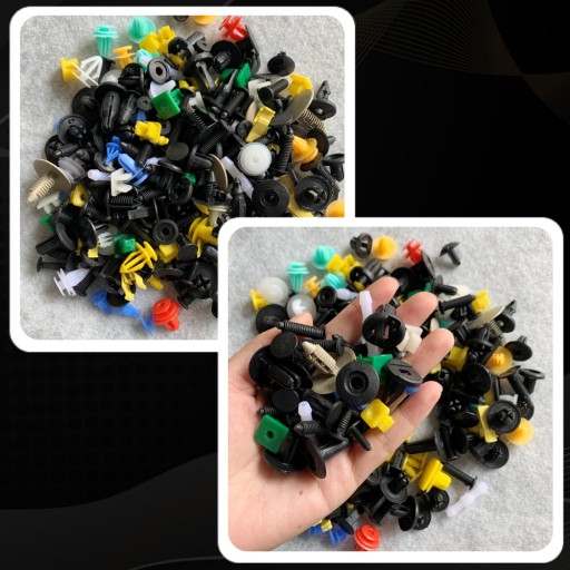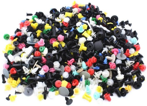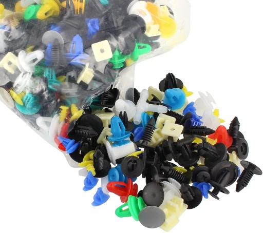 Uniwersalny zestaw akcesoriów do mocowania tapicerki, plastiku, zderzaków, uszczelek itp. w samochodzie, zawiera spineki, kołki, klipsy i zatrzaski o standardowych rozmiarach, które są powszechnie stosowane w większości marek samochodów.