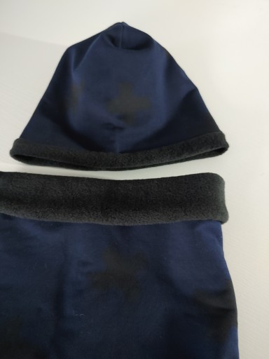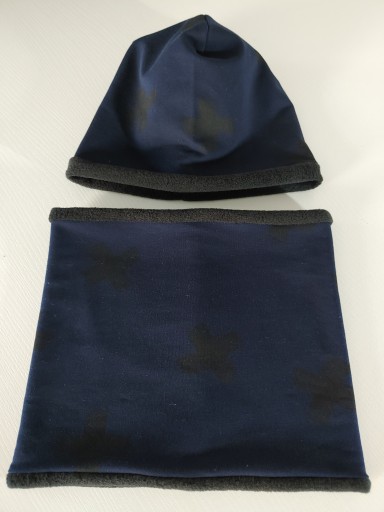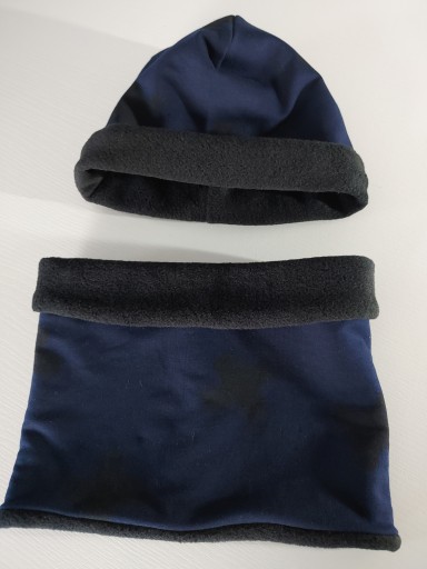 W skład kompletu wchodzi czapka i komin z dzianiny dresowej podszyte cieplutkim polarem .