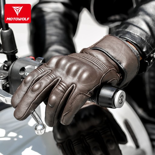 Rękawice MOTOWOLF są niezwykle lekkie i wygodne. Największą ich zaletą dzięki specjalnej powłoce jest możliwość obsługi telefonu palcem wskazującym. Rękawiczki zapinane są na rzep dzięki czemu ich zakładanie jest szybkie i wygodne. Idealnie dopasowują się do kształtu dłoni. Rękawice posiadają eleganckie osłony kostek i palców przykryte skórą dla lepszej estetyki i jednolitości. Wykonane są ze skóry. Starannie wykonane poszycia nie uwierają i nie przeszkadzają podczas jazdy. Przyjemna w dotyku wyściółka o właściwościach termicznych gwarantuje wygodne zakładanie i zdejmowanie, a także doskonale chroni przed zimnem. Można ich używać zarówno do jazdy na motocyklu jak również do biegania, chodzenia po górach, jazdy konnej, strzelectwa czy innych zajęć na świeżym powietrzu.