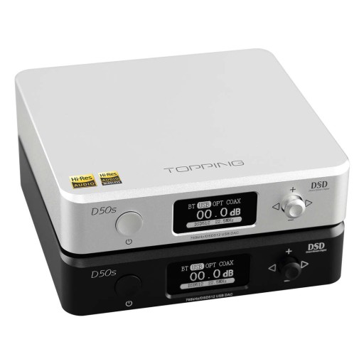 Topping D50s to wysokiej klasy DAC USB z wyjściem liniowym, optycznym i koncentrycznym, do tego jest wyposażony w wyświetlacz OLED o przekątnej 0,96 cala. Wykorzystuje XMOS (XU208), 2 x ES9038Q2M + 3 x OPA1612 i niestandardowe sterowniki zapewniające wsparcie dla DSD512 i PCM 32bit / 768 kHz.