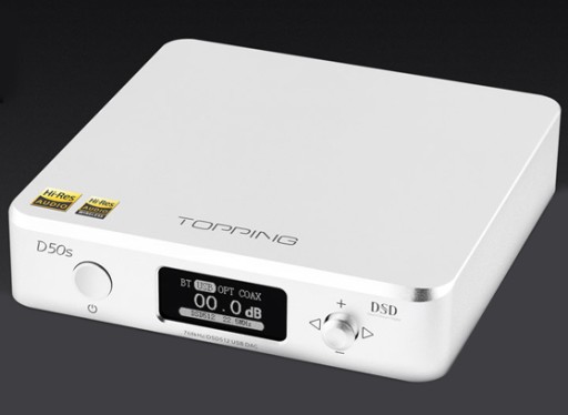 Topping D50s to wysokiej klasy DAC USB z wyjściem liniowym, optycznym i koncentrycznym, do tego jest wyposażony w wyświetlacz OLED o przekątnej 0,96 cala. Wykorzystuje XMOS (XU208), 2 x ES9038Q2M + 3 x OPA1612 i niestandardowe sterowniki zapewniające wsparcie dla DSD512 i PCM 32bit / 768 kHz.