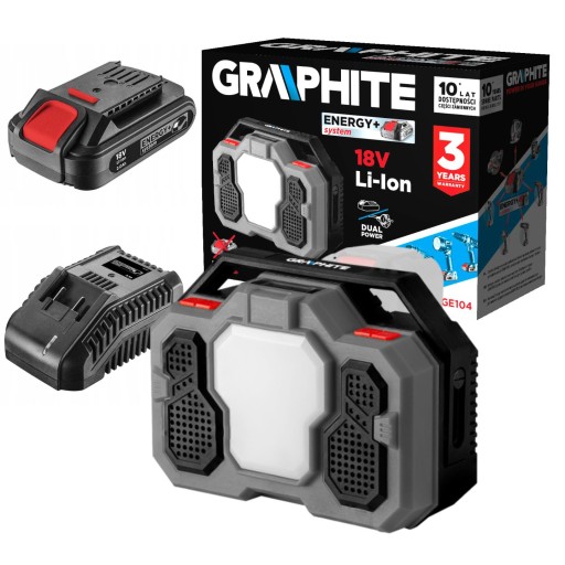 ➡️ Radio akumulatorowo-sieciowe Energy 18 V, Li-lon, bez akumulatora 58GE104 marki GRAPHITE to odporne na kurz, pył oraz delikatne obicia urządzenie, polecane na place budowy, do warsztatów majsterkowiczów oraz na hale.