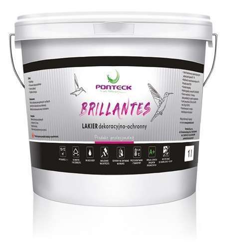 Ponteck BRILLANTES FINITION, to dekoracyjny lakier służący do zabezpieczania tynków dekoracyjnych, pomalowanych powierzchni, tapet, surowego betonu itp. Można go stosować z dodatkami dekoracyjnymi, np. pyłkami, brokatem, płatkami akrylowymi w celu osiągnięcia dodatkowej dekoracji na malowanej powierzchni. Ponteck BRILLANTES FINITION jest odporny na uszkodzenia mechaniczne, zabrudzenia i środki czystości, wydajny, bezrozpuszczalnikowy, nieżółknący oraz szybkoschnący.