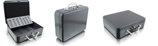 Fabrycznie nowa, wysokiej jakości metalowa kasetka do przechowywania lub transportu monet, banknotów lub innych wartościowych przedmiotów.Solidna i poręczna walizka z metalu wyposażona w sortownik do monet jest idealnym miejscem do przechowywania banknotów oraz monet. Na dole jest sporo miejsca na przykład na rachunki, paragony, monety, banknoty i inne przydatne przedmioty. Dla bezpieczeństwa kasetka jest zamykana na klucz. Ergonomiczny uchwyt sprawia, że transport staje się dziecinnie prosty.