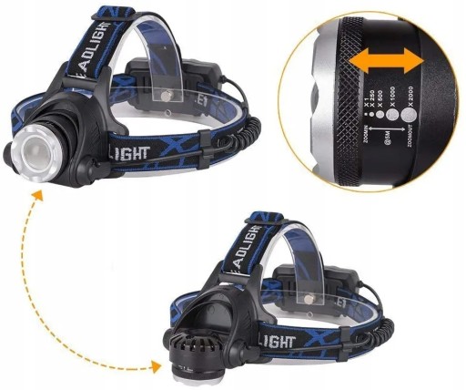 WYSOKIEJ JAKOŚCI LATARKA CZOŁOWA Z REGULOWANYM ZOOM ORAZ KĄTEM ŚWIECENIA