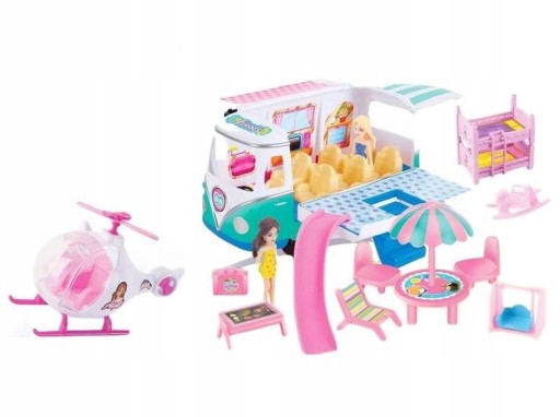 Oferowany zestaw przeniesie nas do życia pięknej lalki, która podróżuje po świecie swoim busem i helikopterem.