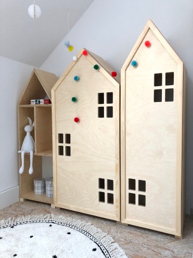 Regały są bardzo funkcjonalne i pozwalają na przechowywanie sporej ilości przedmiotów.Każdy mebel wyposażony jest w nóżki z antypoślizgami, oraz uchwyty mocujące do ściany.W tej wersji regały posiadają drzwi z ozdobnymi okienkami i listewkami o szerokości 3 cm. Meble wykonane są z wysokiej jakości płyty stolarskiej o grubości 18 mm, która cechuje się bardzo wysoką trwałością. Meble są zabezpieczone lakierem wodnym, w pełni bezpiecznym dla dzieci.