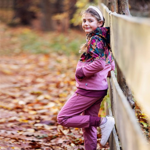 Dziewczęce spodnie doskonałe na zabawę na świeżym powietrzu. Uszyte z trwałej, wiatroodpornej tkaniny softshell, składają się aż z trzech warstw: