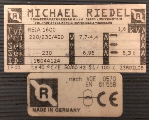 Transformator Michael Riedel Reia 1600 PRI 220-400V SEC 230V 6,96A