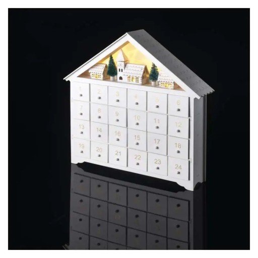 Urocza ozdoba świąteczna w postaci kalendarza adwentowego to świetny prezent na Mikołaja czy inna okazję. Kalendarz adwentowy białek domek posiada 24 małe wysuwane szufladki na drobiazgi oraz 8 diod led delikatnie podświetlających konstrukcję domku. Diody świecą klimatyczną cieplą barwą światła z mocą 0,4W. Drewniany kalendarz z diodami led wymaga zasilania 2 bateriami AA ( brak w zestawie). Wymiary dekoracji bożonarodzeniowej to 33x35cm. Produkt przeznaczony jest do użytku wewnątrz pomieszczeń.