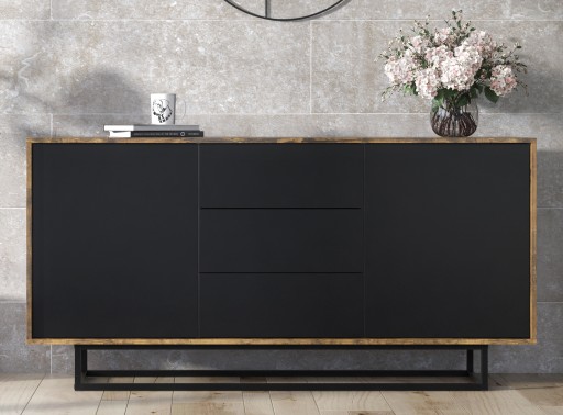 Oryginalna komoda w stylu loftowym, której konstrukcja wykonana jest z wysokiej jakości płyty laminowanej o grubości 15 mm gwarantującej wytrzymałość. Mebel posiada dwoje drzwi oraz trzy szuflady. Zarówno drzwiczki, jak i szuflady otwierają się przy wykorzystaniu systemu push to open. Cały mebel posadowiony został na metalowej ramie w kolorze czarnym, co zdecydowanie nadaje mu niebywałego charakteru. Oryginalny design mebla sprawia, że zachwyci on niemal każdego gościa Twojego domu.