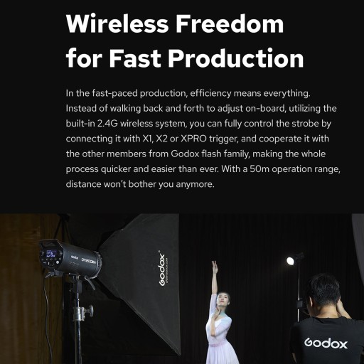 Bezprzewodowa swoboda dla szybkiej produkcji: Zamiast chodzić tam i z powrotem w celu regulacji na pokładzie, korzystając z wbudowanego systemu bezprzewodowego 2.4G, możesz w pełni kontrolować stroboskop, łącząc go z wyzwalaczem X, X2 lub X PRO (brak w zestawie) do sprawić, że cały proces będzie szybszy i łatwiejszy. Dzięki zasięgowi działania 50 m odległość nie będzie Ci już przeszkadzać.