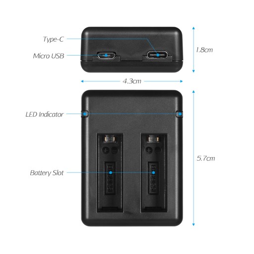 Ładowarka obsługuje ładowanie dwóch akumulatorów jednocześnie, obsługa ładowania oryginalnych akumulatorów, wskaźnik świetlny pokazuje stan ładowania (czerwony: ładowanie, zielony: w pełni naładowany ), zaprojektowany z 2 interfejsami, są to Micro USB i Type-C, bardzo praktyczne.