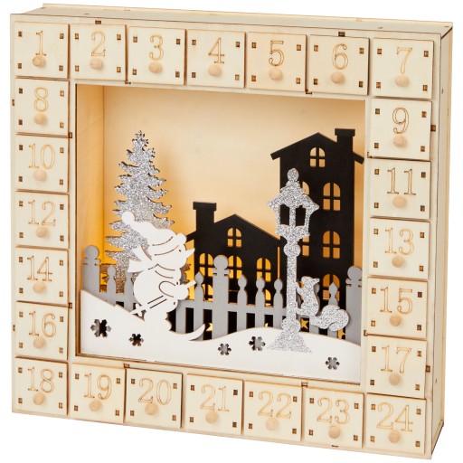 ДЕРЕВЯННЫЙ АДВЕНТ-КАЛЕНДАРЬ СО СВЕТОДИОДНОЙ ПОДСВЕТКОЙ СНЕГОВИК НА ЛЫЖАХ