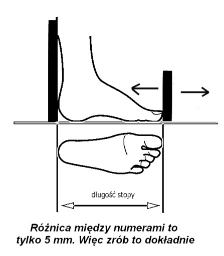 koniecznie zmierz stopę,jedyny prawidłowy sposób jest taki: stań na podłodze,przystaw piętę do pionowej powierzchni,zrób kreseczkę przy dużym palcu, zmierz dokładnie odległość,1 rozmiar to tylko 6 mm !!!!nie stawaj na linijce, nie używaj przymiaru krawieckiego, nie odrysowuj stopy na kartce