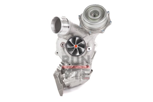 Koło kompresora zostało wymienione na frezowane koło aluminiowe o najnowocześniejszej geometrii, łopatki 7+7, co daje dodatkową moc. Podobnie, zmieniamy oryginalną turbinę wydechową na znacznie większą, ale bardzo lekką 9-łopatową turbinę zaprojektowaną przez TTE, zapewniającą niższe ciśnienie wsteczne gazów wydechowych, co daje większą wydajność. Zainstalowaliśmy również sprawdzony, ulepszony system łożysk TTE do sportów motorowych, aby zapewnić trwałość.
