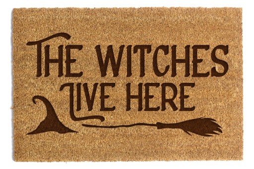 Wycieraczka pod drzwi z napisem "THE WITCHES LIVE HERE" - Idealna na jesień oraz jako Halloweenowy dodatek.