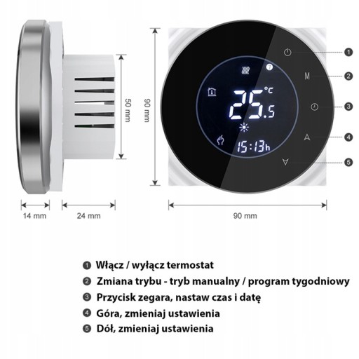Uwaga! Oferowana najnowsza wersja termostatu posiada metalizowaną obwódkę panelu, czarny panel oraz czarny tył w całości czarny jak na zdjęciu obok. Pozostałe rysunki są poglądowe.