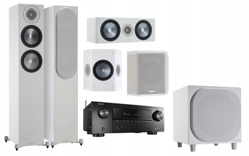 Monitor Audio Bronze 6G kolor White - biały - zestaw kina domowego 5.1 z subwooferem + topowy amplituner Denon AVR-X2700H, nowy, fabrycznie spakowany kompletny zestaw kina najwyższej klasy.