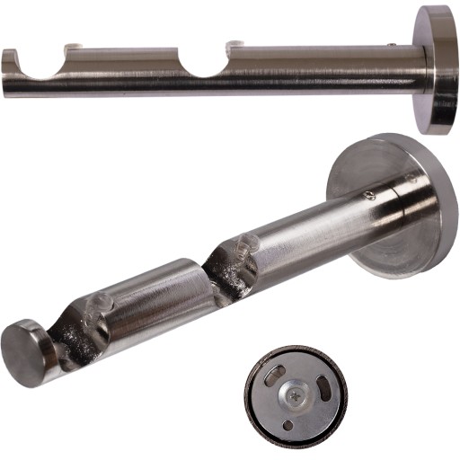 Wspornik karnisza o średnicy rurki fi 19+19 wykonany jest z metalu, pokrytego powłoką galwaniczną oraz dodatkową warstwą utwardzonego lakieru, która zapewnia doskonałą ochronę powierzchni przed ścieraniem.