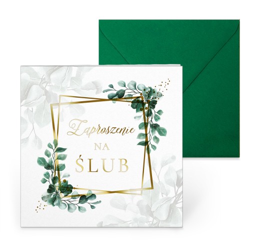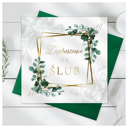 PIĘKNE ZAPROSZENIA ŚLUBNE, ZŁOCONE, GOTOWE DO WYPEŁNIENIA w zestawie z kopertą z motywem liści eukaliptusa.