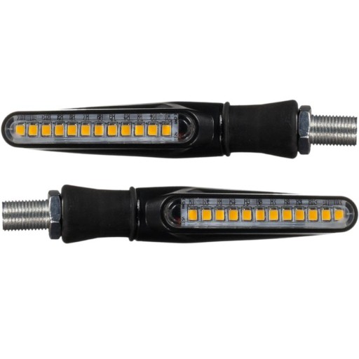 Uniwersalne kierunkowskazy LED do jednośladów. Doskonały dodatek do Twojego motocykla. Diody LED dają mocne, pomarańczowe światło- znacznie poprawiając widoczność. Charakterystyczne, dynamiczne przejście diod LED podczas wykonywania manewru zwiększa wrażenie estetyczne. Pasują do wszystkich motocykli wyposażonych w standardowy gwint M10.