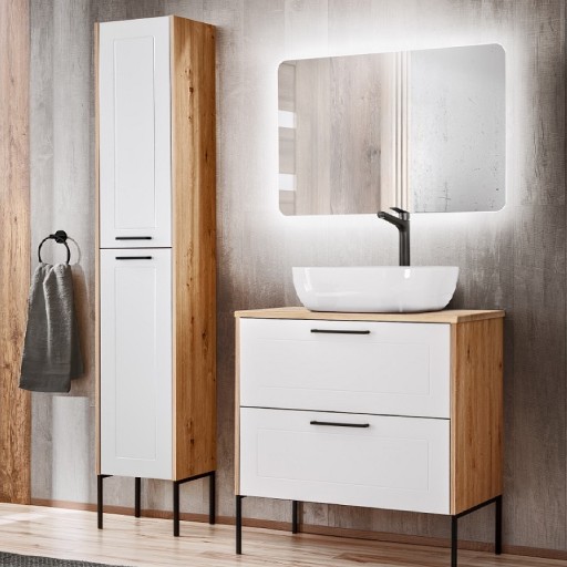 Madera White to bryły zaprojektowane w nowoczesnym stylu, dzięki czemu z łatwością wkomponują się w niemal każdą aranżację. Białe fronty oraz korpus w kolorze dębu Vintage. Meble łazienkowe z kolekcji Madera White to wygoda użytkowania i funkcjonalność. W skład kolekcji wchodzą szafki podumywalkowe, słupek wysoki, szafki lustrzane. Szeroka gama szafek czyni tą kolekcję jedną z najbardziej modułowych w naszej ofercie dzięki czemu wpasuję się do łazienek w niemalże wszystkich wymiarach.