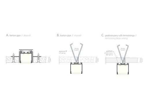 - Sposób mocowania: sprężyny powierzchniowe GP, sprężyny do wpustów KMA, zawieszki DP, profil TEKNIK
