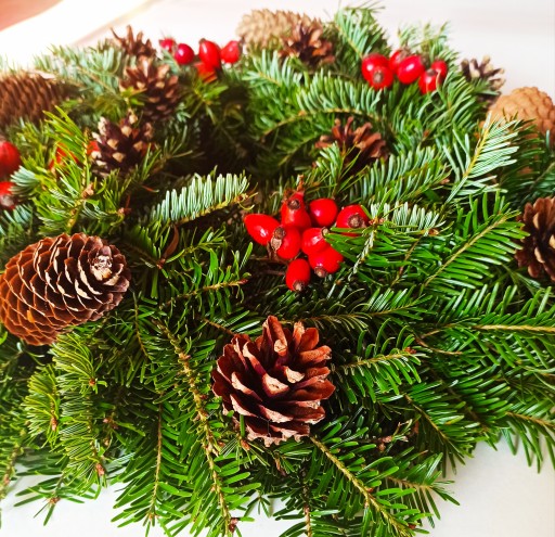 Wieniec naturalny wykonany jest na podkładzie słomy z gałązek żywej jodły. Ozdobiony szyszkami sosny i świerka. Dodatkowo czerwonymi owocami dzikiej róży