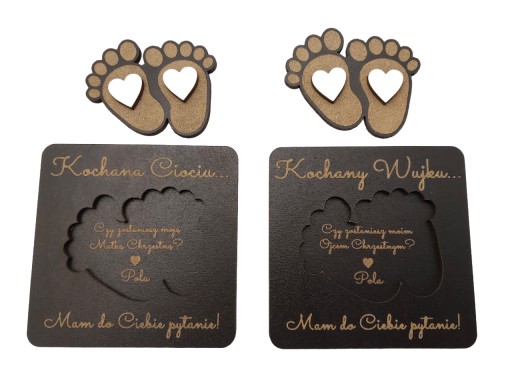 Po wyjęciu Stópek widoczne jest pytanie: Czy zostaniesz moją Matką Chrzestną? Czy zostaniesz moim ojcem chrzestnym?