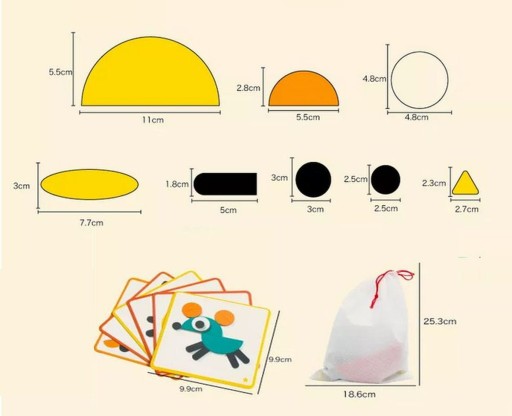 W zestawie są karty z rożnymi figurami jakie można ułożyć z klocuszków. Poszczególne figury występują w różnych kolorach, a w zestawie znajdują się karty o różnym poziomie trudności, które oznaczone są gwiazdkami oraz z obrazkami do układania. Im więcej gwiazdek na obrazku tym trudniejsza do ułożenia figura.