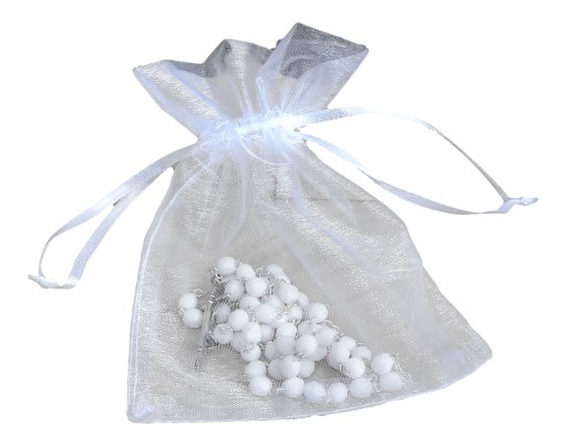 - Wyposażenie - srebrna świeczka na roczek, piękny różaniec z motywem sakralnym, piękne białe skarpetki, biały woreczek gdzie włożysz gotówkę, pudełeczko na pierwszy ząbek, kupo lotto