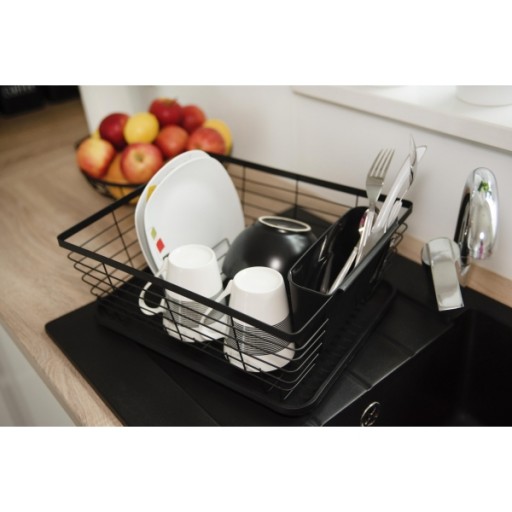 Suszarka do naczyń KOBE jest wykonana z metalowego drutu malowanego proszkowo. Wyposażona w plastikową podstawkę oraz ociekacz na sztućce. Ociekacz jest zdejmowany, więc może być zamocowany w dowolnym miejscu suszarki. Suszarka posiada przegrody, ułatwiające organizację naczyń. Jest niezwykle pojemna, pomieści zarówno kubki, miseczki jak i duże talerze. Suszarka jest trwała i łatwa w utrzymaniu czystości. Praktyczna i funkcjonalna. Połączenie czarnego matowego plastiku i metalu sprawia, że jest bardzo elegancka i nowoczesna.