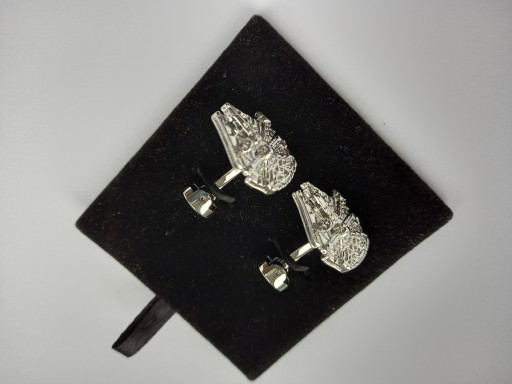 Oryginalny zestaw spinek do mankietów koszuli wykonany ze stopów metali szlachetnych i emalii akrylowych. Zestaw pary spinek w stylu Gwiezdnych Wojen wehikuł Sokół Millenium jest wyprodukowany przez naszą manufakturę spinek, jako oryginalny projekt z limitowanej serii "Only for You" Tylko dla Ciebie i zapakowane w ekskluzywne etui do spinek.