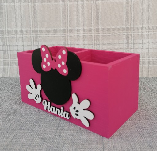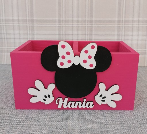 Przybornik został przez nas pomalowany na kolor fuksjowy a jego dodatkową ozdobą jest dekor Myszki Minnie oraz imię dziecka, które należy podać przy składaniu zamówienia.
