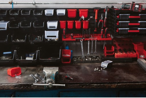 Warsztatowa tablica narzędziowa z pojemnikami Kistenberg Orderline KOR2 do dowolnej aranżacji przestrzeni warsztatowej lub magazynowej. Wykonane z odpornej mieszanki polimerów.