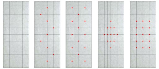 Przygotuj sobie szablon - rozciągając na tapicerce nitkę i zaplanuj rozmieszczenie guzików. W celu uzyskania efektu wgłębienia, guziki należy przybić bezpośrednio do drzwi za pomocą młotka. Warto przyłożyć do główki guzika kawałek grubego materiału lub gumy, w celu osłony jego powierzchni przed uderzeniami młotka. Poniższe schematy są tylko przykładowe, układ guzików zależy w 100% od Twojej wyobraźni.