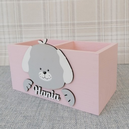 Przybornik został przez nas pomalowany na jasno różowy kolor a jego dodatkową ozdobą jest namalowany przez naszych plastyków dekor oraz imię dziecka, które należy podać przy składaniu zamówienia.