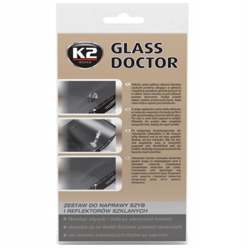 - K2 GLASS DOCTOR to zestaw naprawczy do szyb. Został stworzony, aby w prosty sposób wypełnić punktowe pęknięcia czy uszkodzenia w postaci pajączka na szybie.