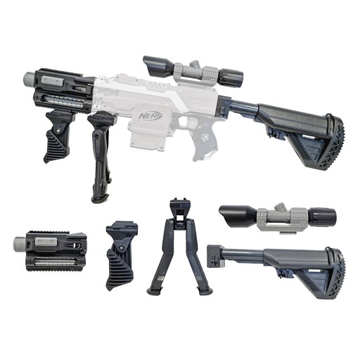 Oto 4-częściowy zestaw, który w niesamowity sposób zmieni wygląd twojej wyrzutni. W zestawie znajduje się: kolba, celownik snajperski, lufa z dwoma szynami, dwójnóg oraz uchwyt szturmowy.