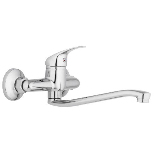 Mechaniczna bateria zlewozmywakowa, ścienna, jednouchwytowa. Posiada długą, obrotową wylewkę oraz ceramiczną głowicę.