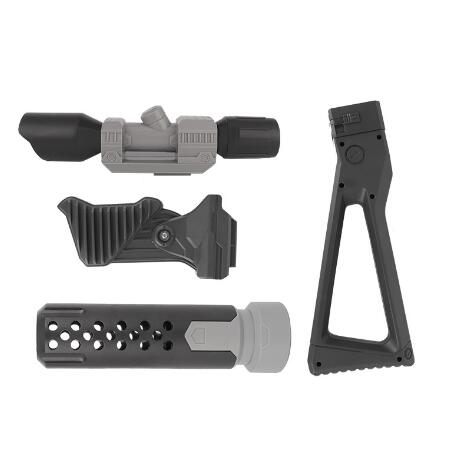 - w skład zestawu wchodzi: kolba, celownik snajperski, tłumik oraz uchwyt szturmowy,