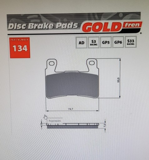 Nowe klocki hamulcowe czeskiej firmy GOLDFREN, oznaczenie 134 RACING S3 wersja sinterowa. Oferta dotyczy kompletu klocków na jedną tarczę hamulcową. Pełne zestawienie modeli motocykli do których pasują poniżej.