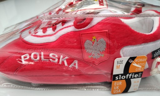 Wykonane w kształcie buta piłkarskiego z mocną gumową podeszwą. Ze względu na sznurowadła, klapkę z Polskim Orlem i gumowymi ćwiekami od spodu kapcie wyglądają jak prawdziwy but piłkarski.