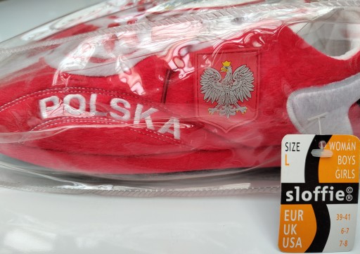 Wykonane w kształcie buta piłkarskiego z mocną gumową podeszwą. Ze względu na sznurowadła, klapkę z Polskim Orlem i gumowymi ćwiekami od spodu kapcie wyglądają jak prawdziwy but piłkarski.