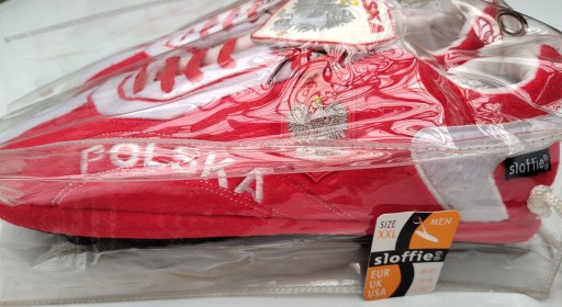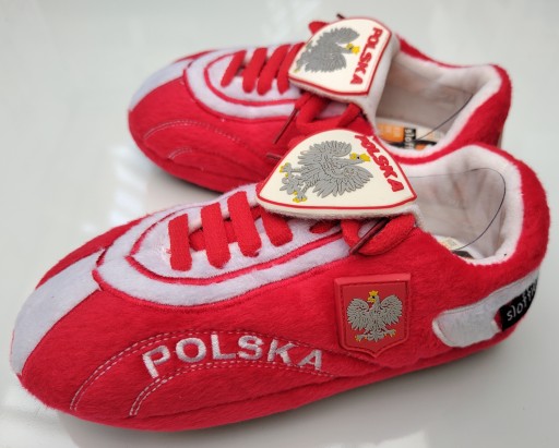 Wykonane w kształcie buta piłkarskiego z mocną gumową podeszwą. Ze względu na sznurowadła, klapkę z Polskim Orlem i gumowymi ćwiekami od spodu kapcie wyglądają jak prawdziwy but piłkarski.