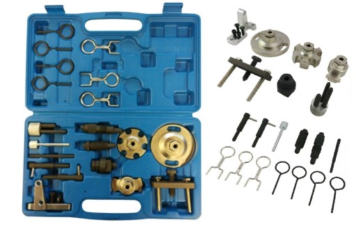 Zestaw zawiera:Blokady wałków rozrządu Przyrząd do obrotu wału karbowego Regulator położenia wałka rozrządu Blokada wału korbowego Blokada pompy wody i de / montaż Trzpienie o śr. 3.3 mm 4 szt.Kołki mocujące do napinacza łańcucha 3 szt.
